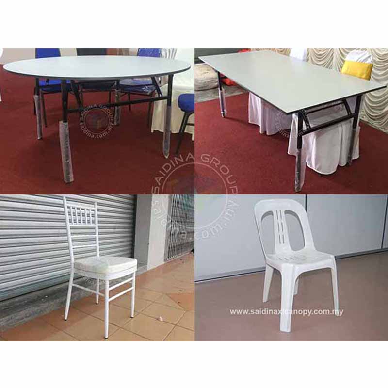 A complete banquet hall furniture package featuring round dining tables, square buffet tables, and chairs for any celebration or event held in a hall.