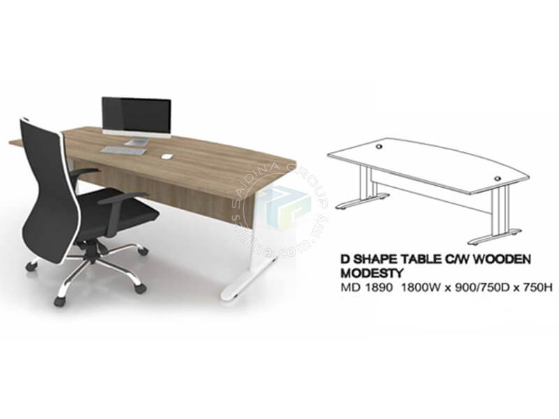 High-quality executive table featuring a D-shaped tabletop and wooden modesty panel made from chipboard, paired with J-shaped metal legs for a modern and sturdy design.