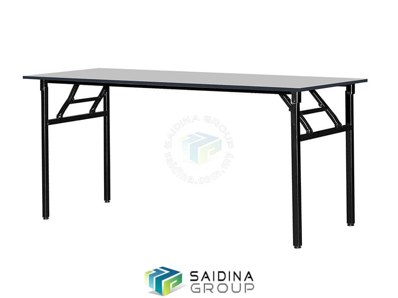Made with a chipboard top and foldable black epoxy-coated steel legs.